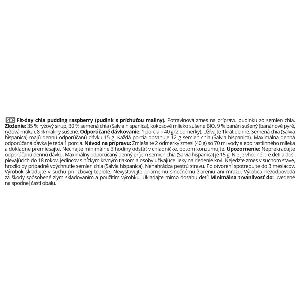 Návod na prípravu: Zmiešajte 2 odmerky zmesi (40 g) so 70 ml vody alebo rastlinného mlieka a dôkladne premiešajte. Nechajte minimálne 3 hodiny odstáť v chladničke, potom konzumujte.
